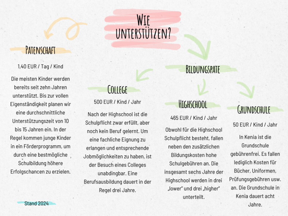 Hilf uns dabei, Kindern und Jugendlichen in Kenia eine echte Chance auf ein selbstbestimmtes und unabhängiges Leben zu geben. Mit unserem offenen Beitragskonzept möchten wir jedem die Chance bieten, so zu unterstützen, wie er kann und mag. Zur Orientierung bieten wir nebenstehend einige finanzielle Informationen.